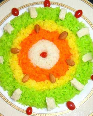 উপকরণ: আতপ চাল ২০০ গ্রাম। ঘি পরিমাণ মতো। চিনি স্বাদ মতো। খাবার রং (সবুজ, কমলা, হলুদ)। তেজপাতা, এলাচ ও দারুচিনি ২টি করে। পানি, সিদ্ধ করার জন্য আধা লিটার। লবণ ২ চিমটি। ছানা, চেরি ও কাজুবাদাম সাজানোর জন্য । পদ্ধতি: একটি পাত্রে পানি দিয়ে তেজপাতা, এলাচ ও দারুচিনি একসঙ্গে ছোট
